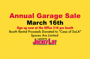 WHAT: Annual Lafayette Garage Sale WHERE: Lafayette Jockey Lot outdoor area WHEN: Saturday; March 16 COST: $10 per space / 1 table provided per space WHAT IS INCLUDED: Your $10 GARAGE SALE Space Rental Fee will include 1 table and 1 space. The Lafayette Jockey Lot will not be providing additional tables for your rented…